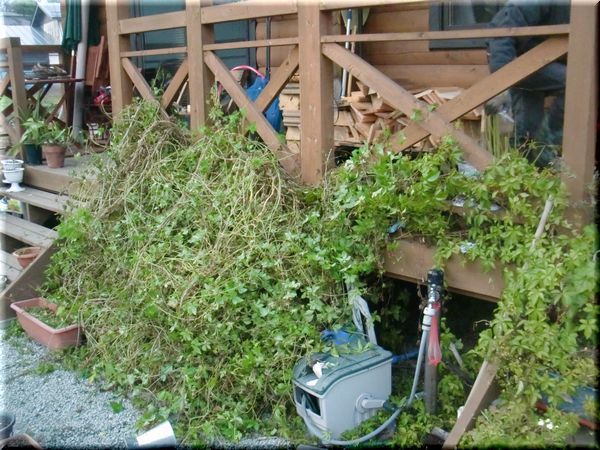 デッキ上、デッキ下、階段、置いていた鉢などに絡みまくったツルを撤去していく。