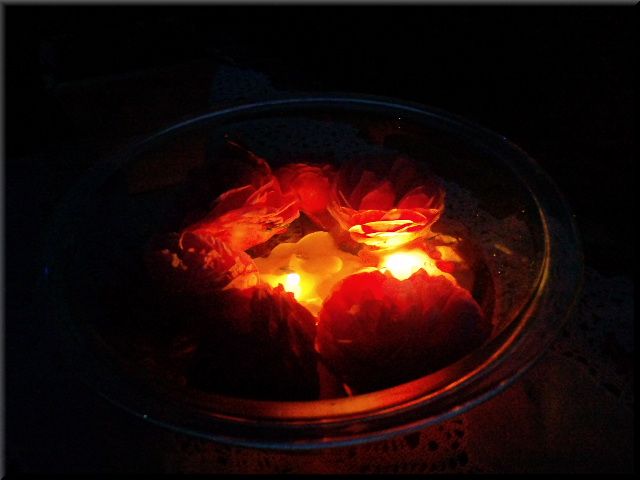 娘が摘んだバラの花を浮かべたガラスの器にフロートキャンドルを浮かべてみました。