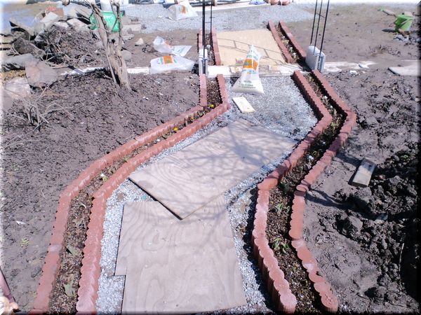 その溝に花壇用ブロックを並べ、アプローチ部分には砕石を敷きました。