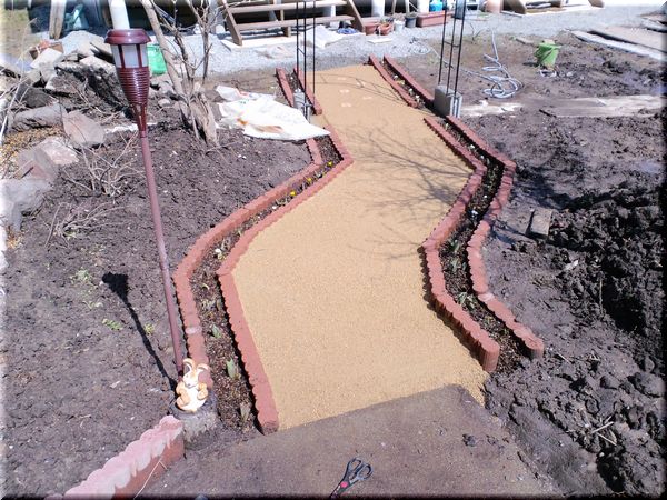 「固まる土」を敷き終えると、これだけでもアプローチとして見栄えが良くなりました!