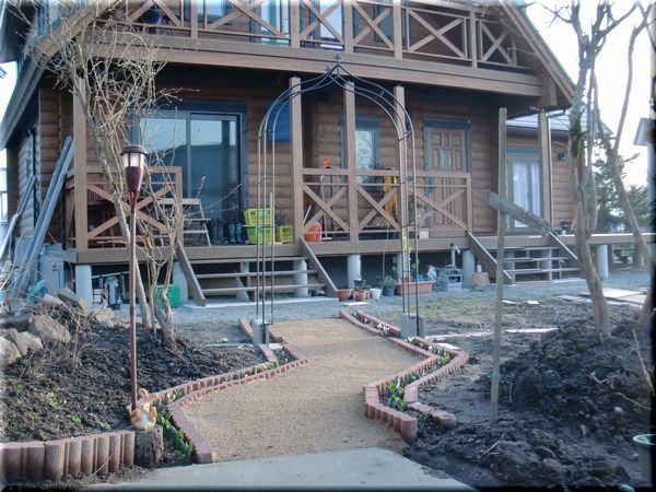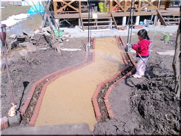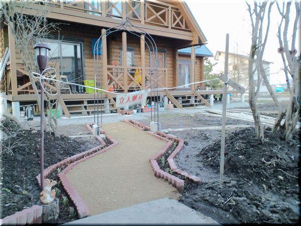 最初は、写真奥にあるような石を敷いてアプローチにしようかとも思いましたが、これじゃぁ味気ないなぁと思ってやめました。