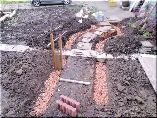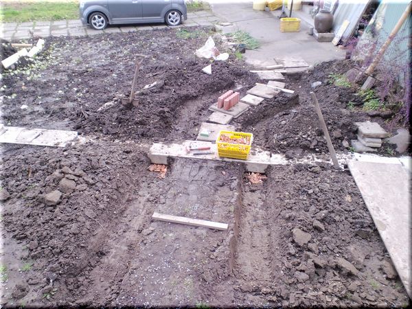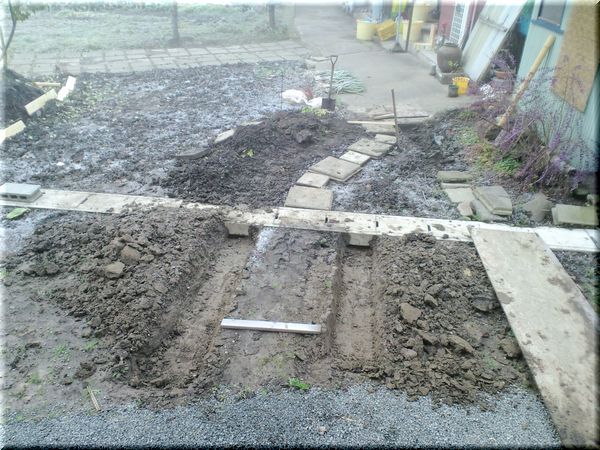 このアプローチの両脇に花壇を作るため、溝を深く幅広く掘りました。
