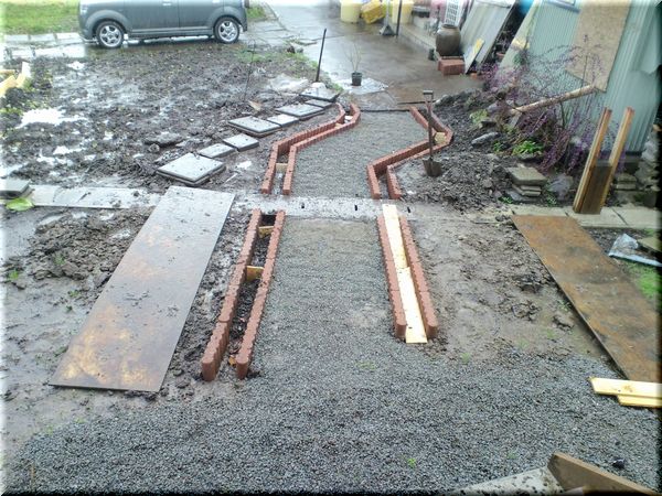 そこで、掘った溝を暗きょにもなるように、より深く掘り、底に砂利を敷いて、アプローチ中央にある排水溝に穴を開けて水が抜けるようにしました。