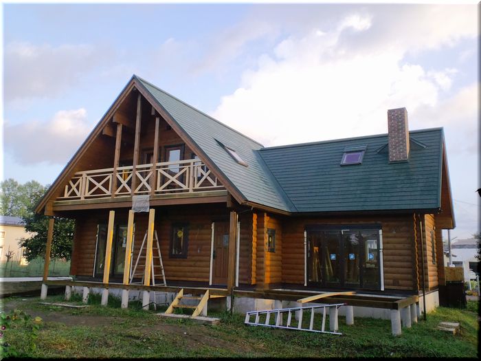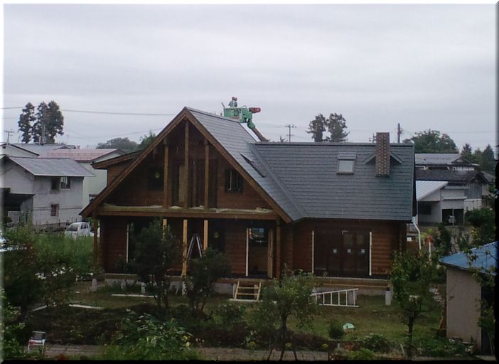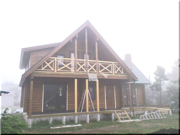 今朝は霧がかかり、ログハウスが幻想的に見えました。