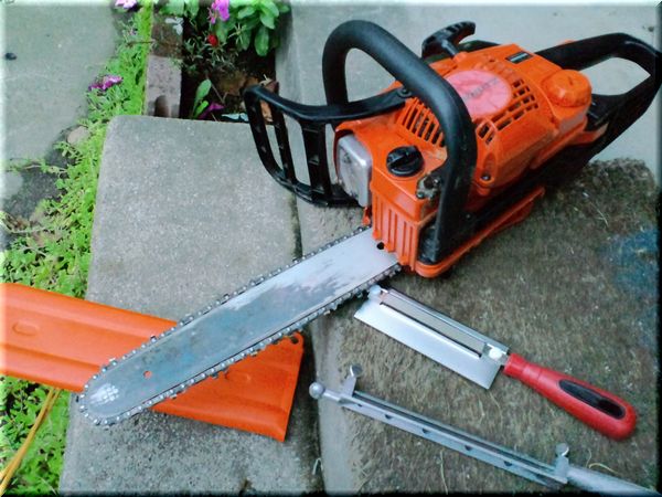 さて、チェンソーもだいぶ切れ味が悪くなってきたんで、初心者ながら目立て作業。