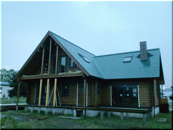 でも、デッキに雨がはねて、ログ材を痛めるのも心配。