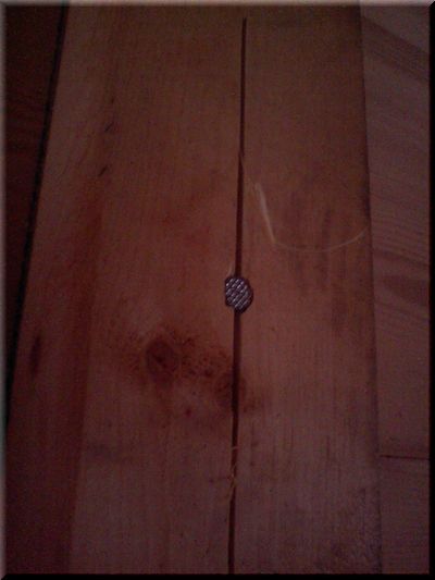 ログ材に釘で固定されている間仕切り用の木材を良く見ると・・・ヒビが!?