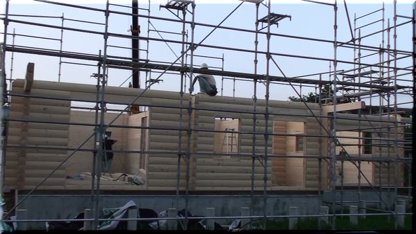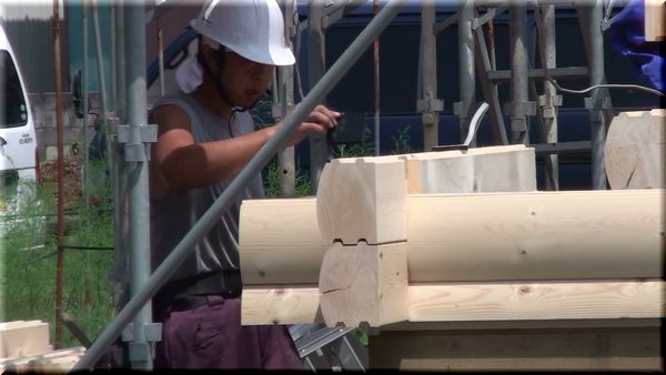 ログ材どうしの緩衝する部分には、しっかりと保護材を。