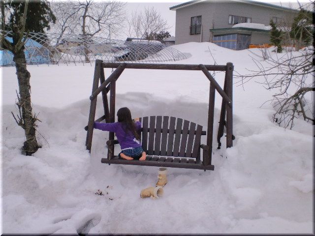 雪消しついでに、家の前にあったブランコの周りも除雪して、ブランコを設置。