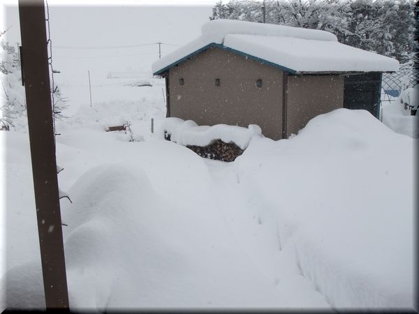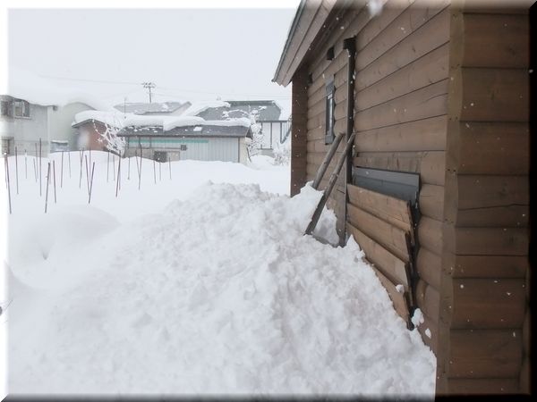 ついに、70cmの基礎も消え、ログ壁まで雪に埋もれてきました...