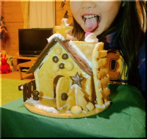 そう言えば、先日作ったお菓子の家に、ついに我が家の巨人がかぶりつきました!