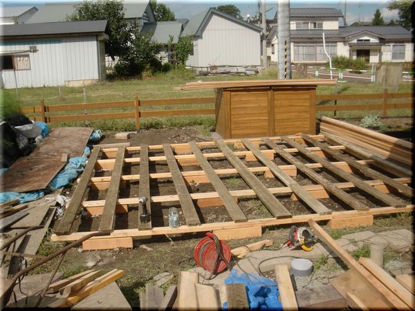 低いデッキをイメージして、さらにお金はかけずに余った木材を使った作業場を、と考えとき、このすのこ状の土台になりました。