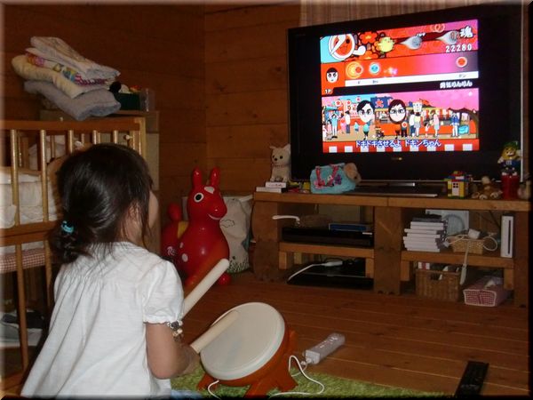4歳でゲーム?ってことにちょっと抵抗ありましたが、Wiiは本物に近い状態で叩けるから、良いかなぁって考えて。