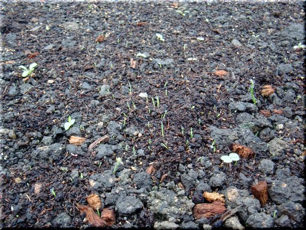 家の基礎には枕木の花壇があり、基礎のコンクリートを隠せるよう背の高いデルフィニウムが咲く予定。まだ、出芽したばかりですが。