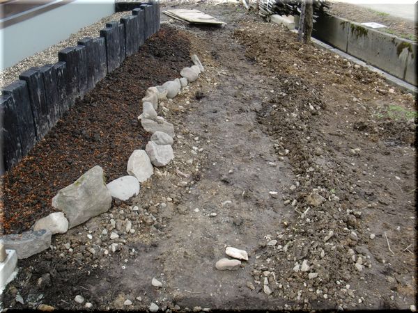 家側の園路境界の石すらまだ集まっていませんが、とりあえず反対側の境界もわかるように土を持ってみました。