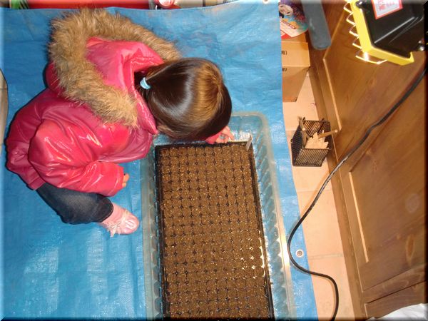 でもでも、寒いのは嫌なので、玄関にシートを広げて種まき作業。