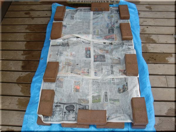 底面潅水するためにブルーシートとレンガを使って、簡易プール作り。