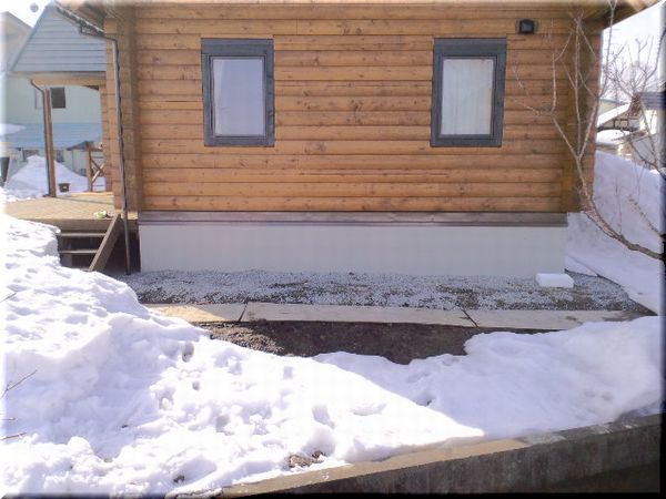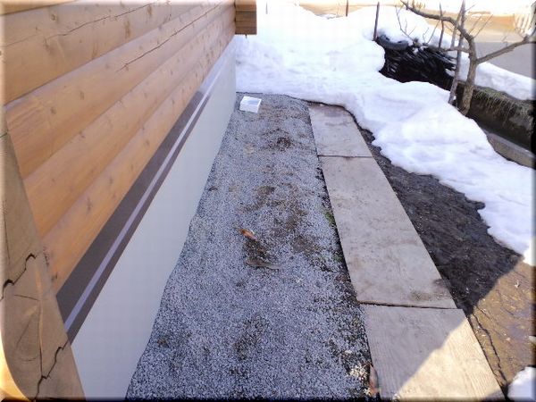さて、その日当たりの良い東側は、基礎のコンクリートむき出しで、ログハウスの雰囲気をぶちこわすアングルでした...