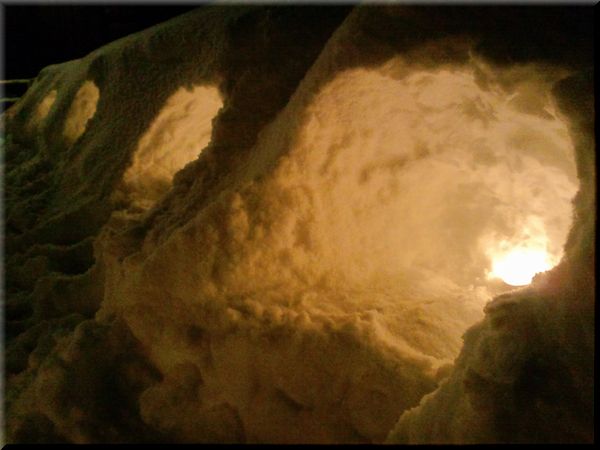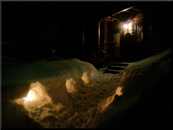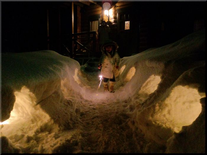 家の前の雪でできた細い道の両脇に、穴を掘ってキャンドル置いて。
